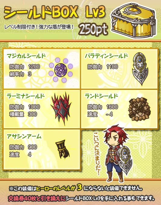 ・このアイテムは、ヒーローのレベルが3以上になっていないと、装備する事ができません。
