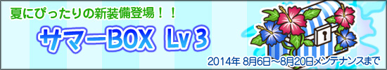 夏にふさわしい装備品がいっぱい!サマーBOX lv3の登場です! 夏祭りやオシャレをイメージしたラインナップになっています。 この夏はヒーローをおしゃれに着飾ってみませんか? 販売期間は8月6日~8月20日 メンテナンスまでです。 詳しい内容は上記バナーから確認してください。 | ||||||||||||||||||||||||||||||||||||||